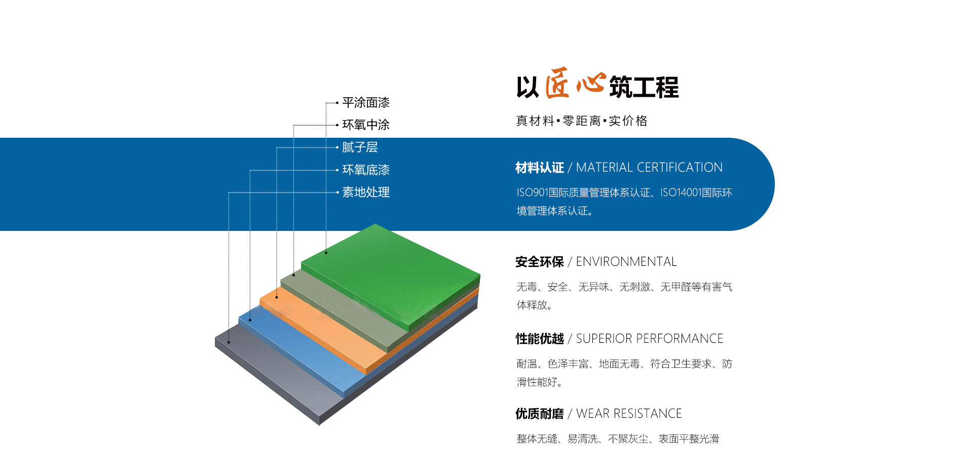 安徽世博裝飾工程有限公司成立于2009年,是一家以外墻涂料、工業地坪設計、施工和銷售為主要的專業性工程公司、是工業地坪施工的專業企業。公司設立了售后服務中心,用戶遍布全國大中小城市,一大批具有標志性的長期合作伙伴?!笆啦┕尽杯h氧地坪工程,受到了越來越多的不同行業用戶的好評及青睞。公司擁有一批經驗豐富的管理人員和專業的施工人員,以保障產品的成功應用,用較小的代價獲得理想的效果,尤其在地坪涂裝方面優勢突出。而且以好的品質管理模式,向客戶提供“獨具魅力”、“性能優異”、“質量穩定”的產品。公司主要產品包括:平涂型環氧地坪、環氧砂漿地坪、環氧樹脂自流平地坪、滾涂型防靜電地坪、自流平防靜電地坪、復古地坪、水性環氧樹脂地坪、彩色透水混凝土地坪、壓花壓模藝術地坪、金剛砂耐磨硬化地坪、混凝土密封固化劑地坪、乙烯基酯重防腐地坪、GEP 標準型地坪、彈性PU運動場地坪、塑膠跑道地坪,PVC橡膠地板、停車場地坪、無震...
